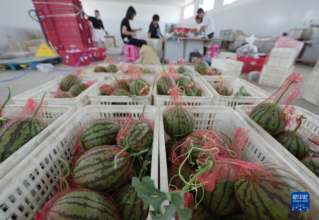 6月5日,盧龍縣木井鎮一家西瓜種植合作社的社員在將收獲的西瓜包裝。