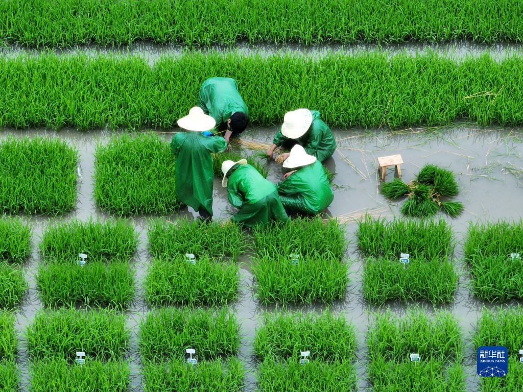 6月5日,農民在江蘇里下河地區農科所(揚州市農科院)的試驗田里勞作(無(wú)人機照片)。