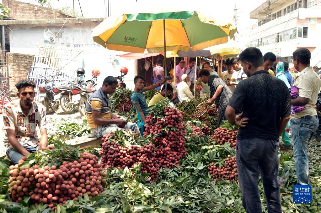 這是6月4日在孟加拉國迪納杰布爾市場(chǎng)中拍攝的待售的荔枝。
