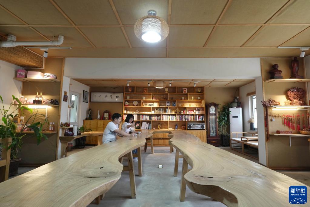 6月5日,游客在秦皇島市北戴河區費石莊村一家精品民宿的茶室內交流。