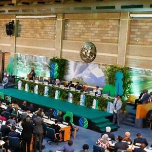 這是6月5日在肯尼亞首都內羅畢拍攝的第二屆聯(lián)合國人居大會(huì )開(kāi)幕式會(huì )場(chǎng)。