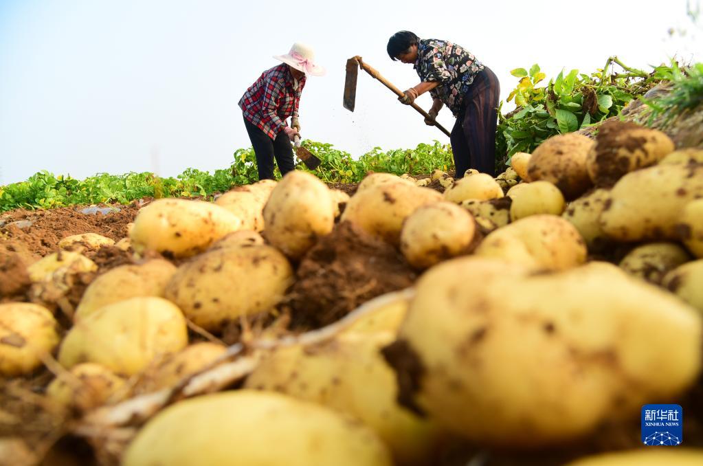 6月6日,在山東省棗莊市山亭區城頭鎮徐洼村,農民在收獲土豆。