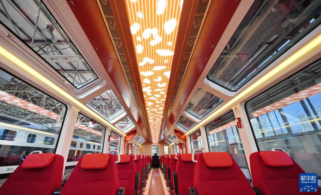這是在中車(chē)唐山公司拍攝的中國中車(chē)出口阿根廷新能源輕軌車(chē)輛首列車(chē)內景(6月6日攝)。
