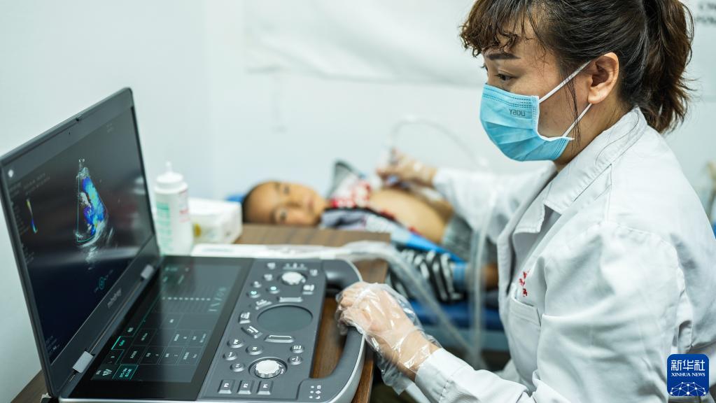 6月6日,在關(guān)嶺布依族苗族自治縣中醫醫院,山東第一醫科大學(xué)附屬中心醫院的醫療專(zhuān)家為小朋友做檢查。