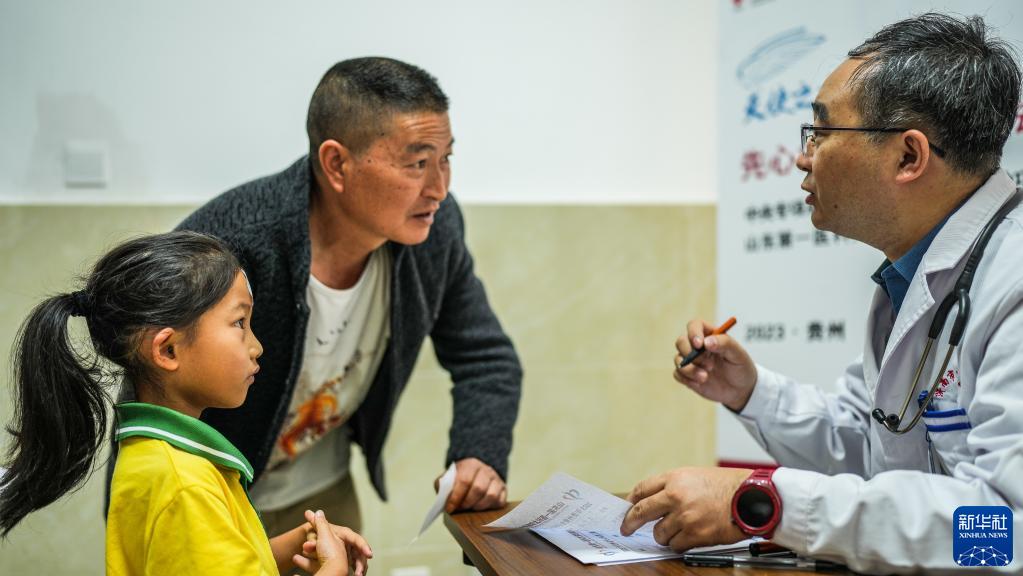 6月6日,在關(guān)嶺布依族苗族自治縣中醫醫院,山東第一醫科大學(xué)附屬中心醫院的醫療專(zhuān)家為小朋友做完檢查后和家長(cháng)溝通。