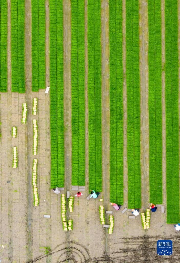 6月6日,村民在泰州市姜堰區顧高鎮塘橋村起秧苗(無(wú)人機照片)。