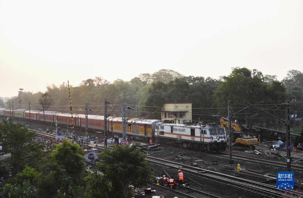 6月5日,在印度東部奧迪沙邦巴拉索爾地區,一列火車(chē)駛過(guò)列車(chē)相撞事故路段。