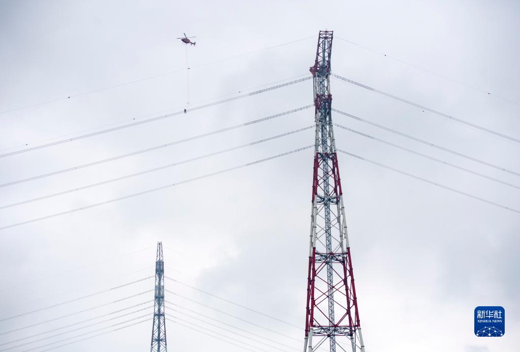 6月6日,在安徽蕪湖的長(cháng)江邊,直升機將檢修人員吊送至±800千伏建蘇線(xiàn)上進(jìn)行帶電作業(yè)。