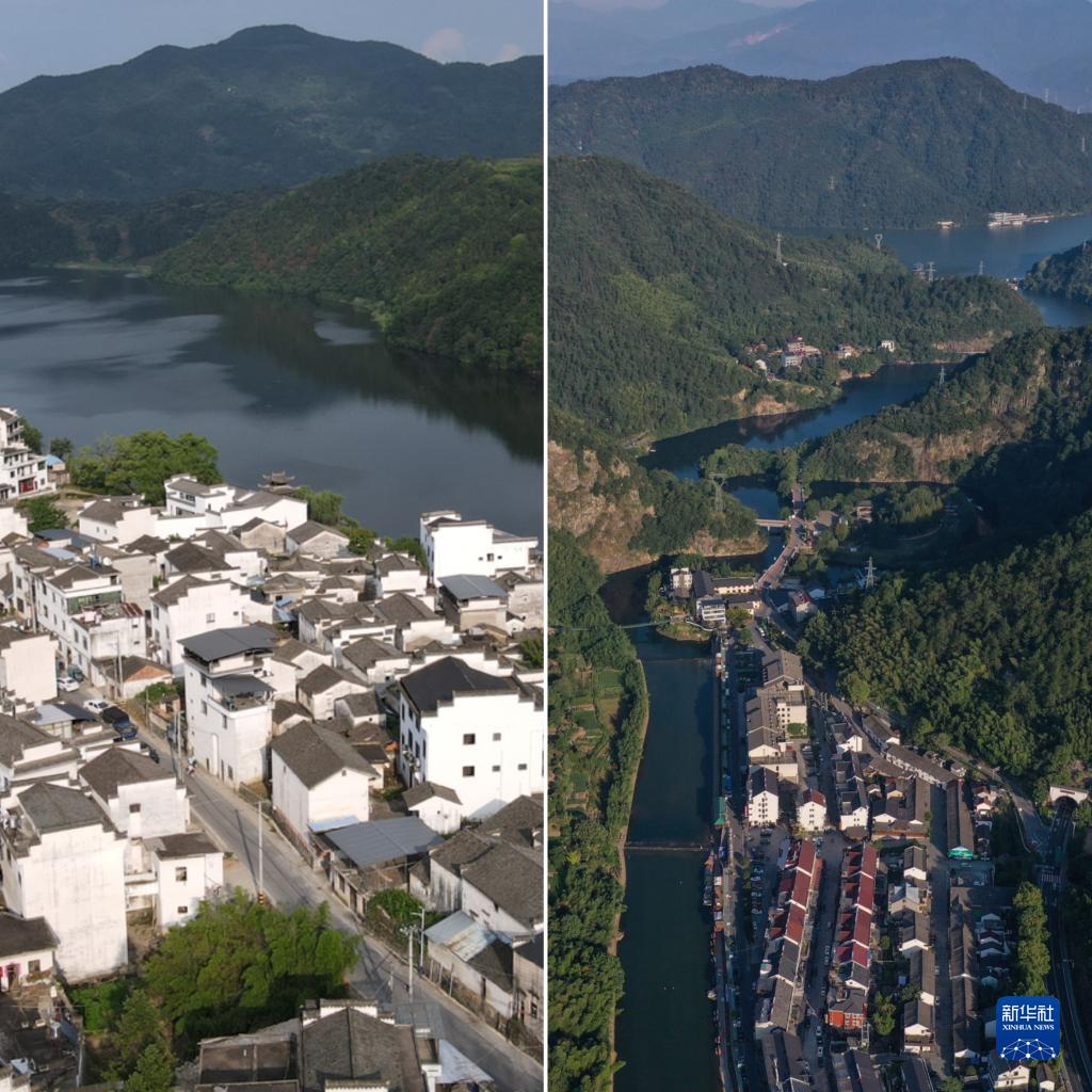 拼版照片:左圖為6月1日拍攝的安徽省黃山市歙縣新安江風(fēng)景(新華社記者張端攝);右圖為2020年9月6日拍攝的浙江省桐廬縣蘆茨村一景(無(wú)人機照片,新華社記者黃宗治攝)。