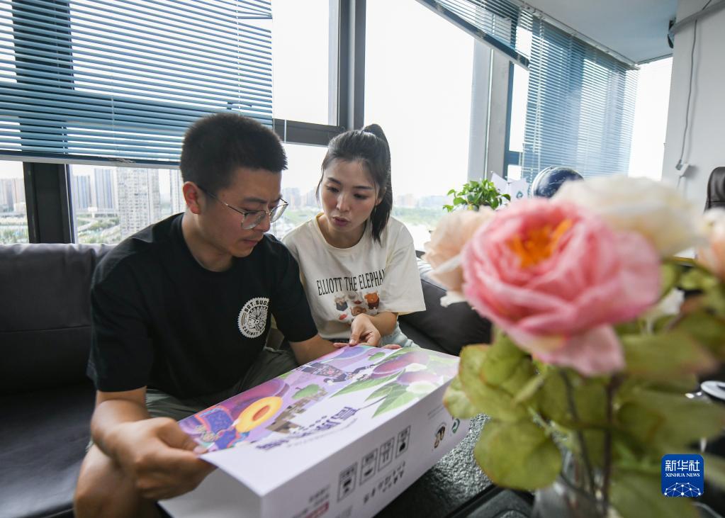 王光強(左)和妻子黃月在成都的電商公司里討論產(chǎn)品包裝(6月1日攝)。