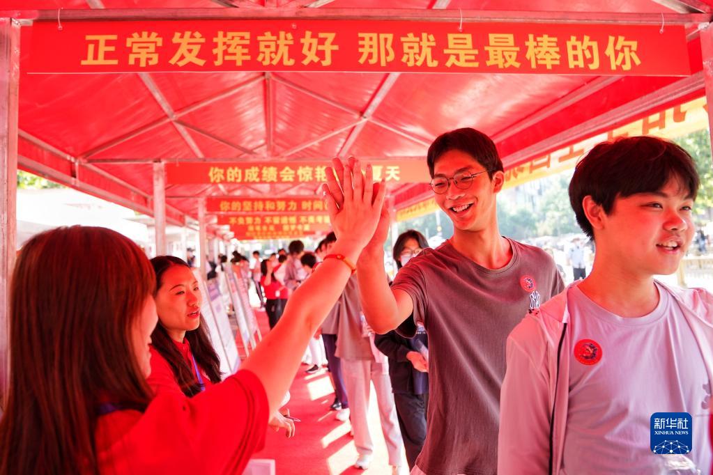6月7日,在北京人大附中經(jīng)開(kāi)學(xué)??键c(diǎn),送考老師與一位考生擊掌,為他加油鼓勁。