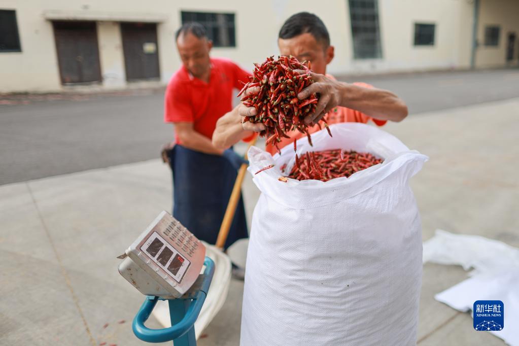 6月6日,工人在貴州省遵義市中國辣椒城將辣椒裝袋。