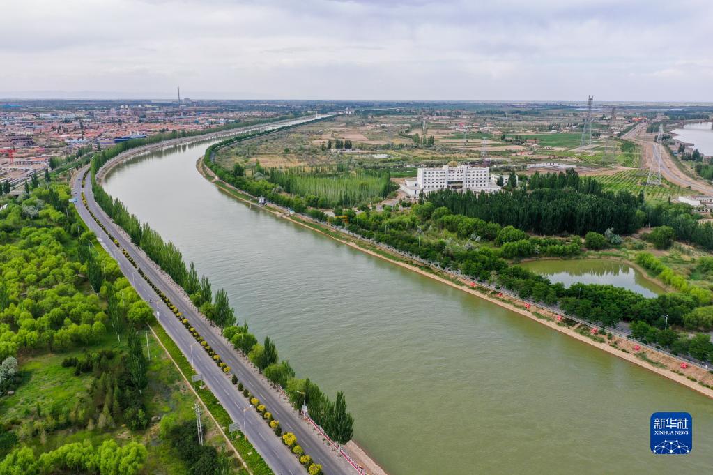 這是三盛公水利樞紐旁的黃河干渠(無(wú)人機照片,6月6日攝)。