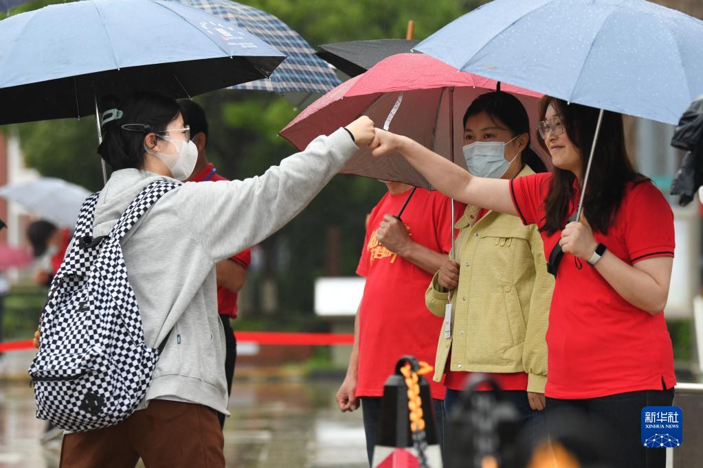 6月7日,在浙江省舟山中學(xué)考點(diǎn)外,送考老師與考生碰拳。
