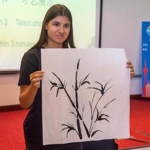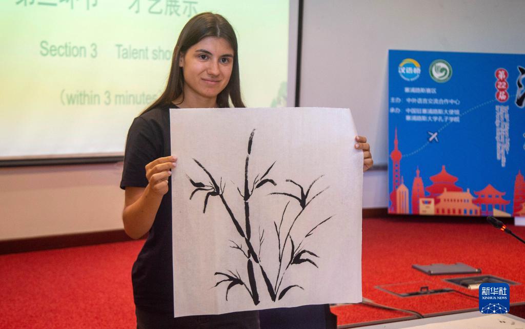 6月6日,在塞浦路斯首都尼科西亞,來(lái)自塞浦路斯大學(xué)的迪亞娜·伊萬(wàn)諾娃在“漢語(yǔ)橋”世界大學(xué)生中文比賽塞浦路斯賽區決賽上展示才藝作品。她最終獲得本次比賽的冠軍。