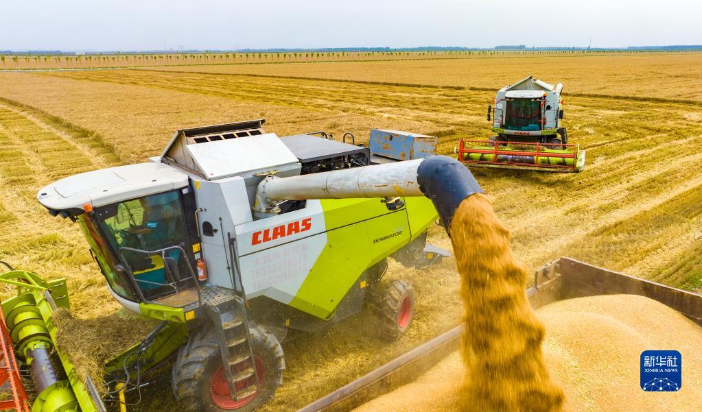 “三夏”時(shí)節,在河南省駐馬店市西平縣老王坡高標準農田,農機手操作大型收割機收割小麥,田間地頭一派忙碌景象。
