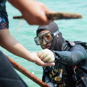距碼頭邊不遠的海南三亞蜈支洲島海域中露出團團氣泡,略顯黝黑的面孔隨之浮出水面,與珊瑚、魚(yú)群打交道十余年之久的王豐國剛剛結束他的水下珊瑚移植作業(yè)。
