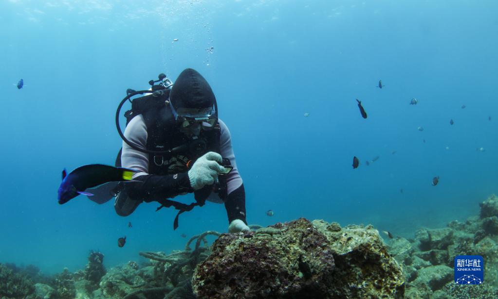 在蜈支洲島海域海洋牧場(chǎng),王豐國在水下開(kāi)展巡護工作(2020年3月28日攝)。