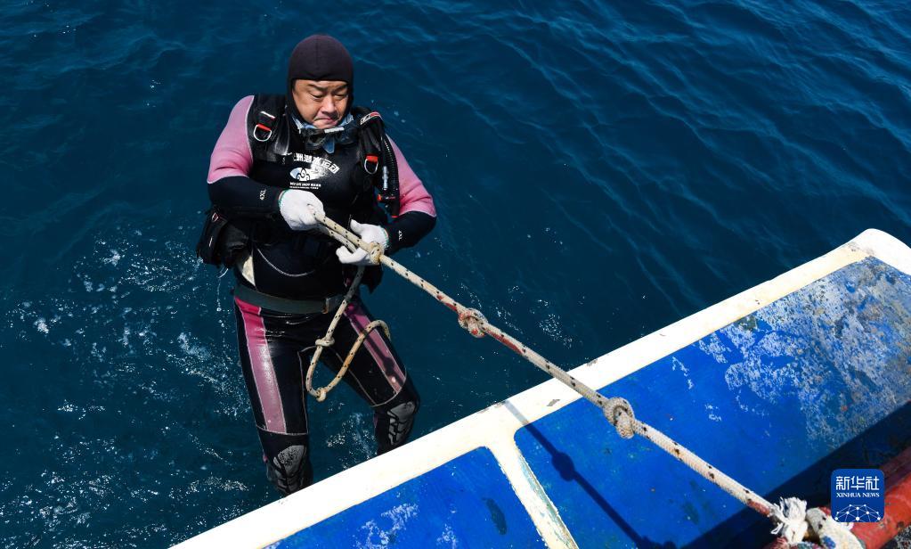 在蜈支洲島海域海洋牧場(chǎng),王豐國結束水下工作后出水上船(2020年3月27日攝)。