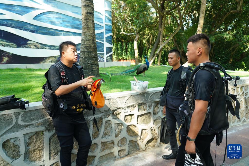 王豐國(左)在水下作業(yè)前,為部門(mén)工作人員安排具體工作內容,講述相關(guān)注意事項(5月17日攝)。
