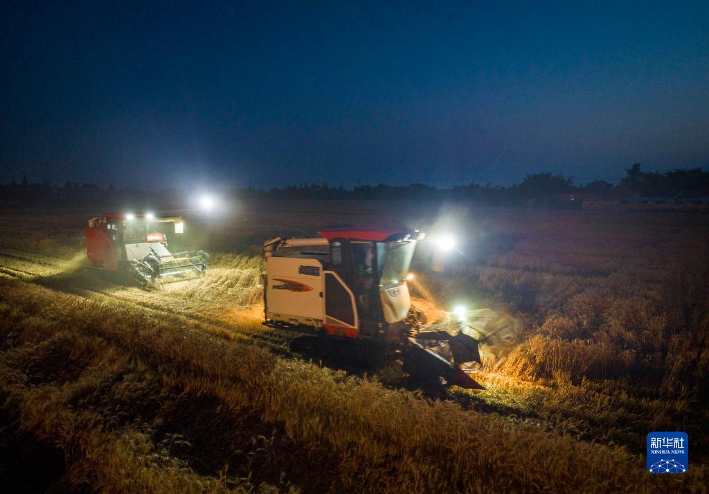 6月6日晚,村民駕駛農機在泰州市姜堰區顧高鎮翟莊村搶收小麥(無(wú)人機照片)。