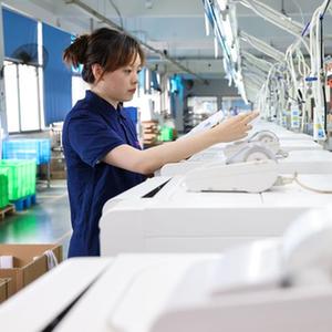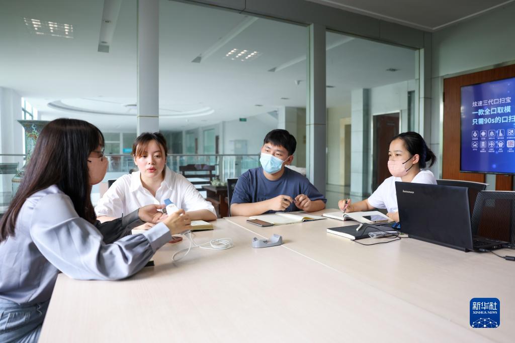 6月7日,徐依(左二)與同事們一起討論一款新開(kāi)發(fā)口腔醫療設備的功能設計。