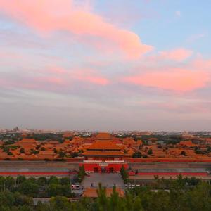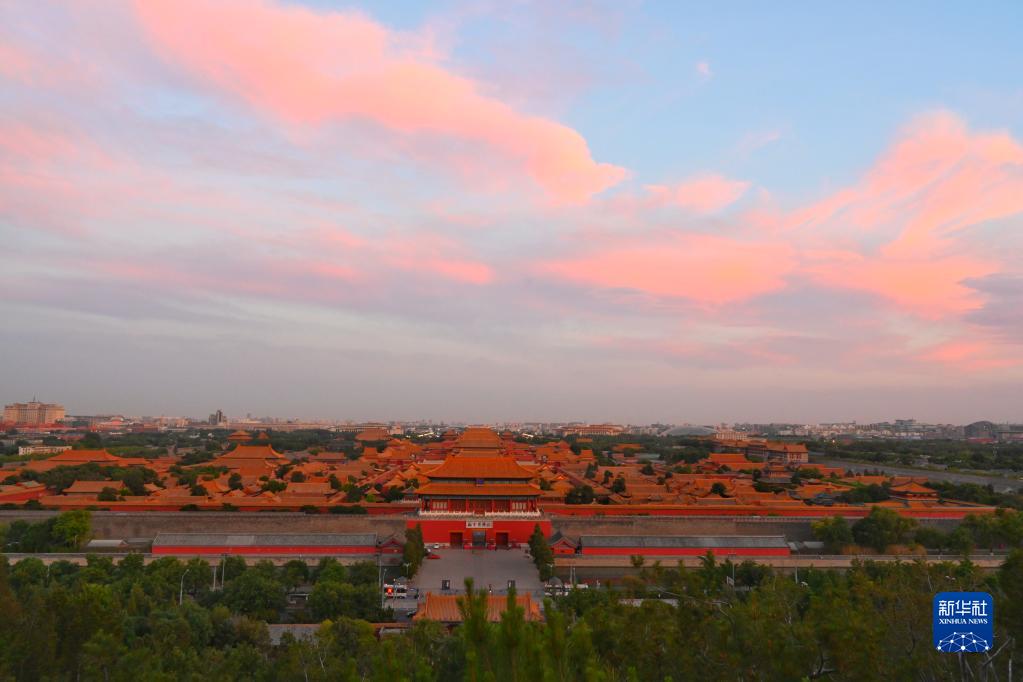 6月7日拍攝的晚霞映襯下的北京故宮博物院。