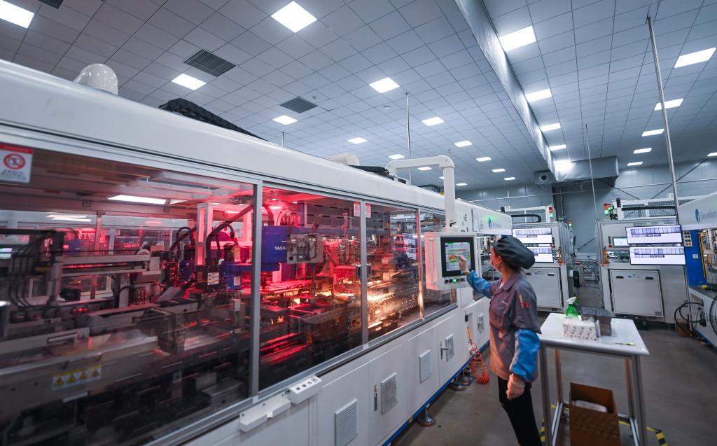 4月11日,在位于浙江省湖州市吳興區織里鎮的浙江貝盛綠能科技有限公司的車(chē)間內,自動(dòng)化流水線(xiàn)在加緊生產(chǎn)出口歐洲的光伏組件。新華社記者 徐昱 攝