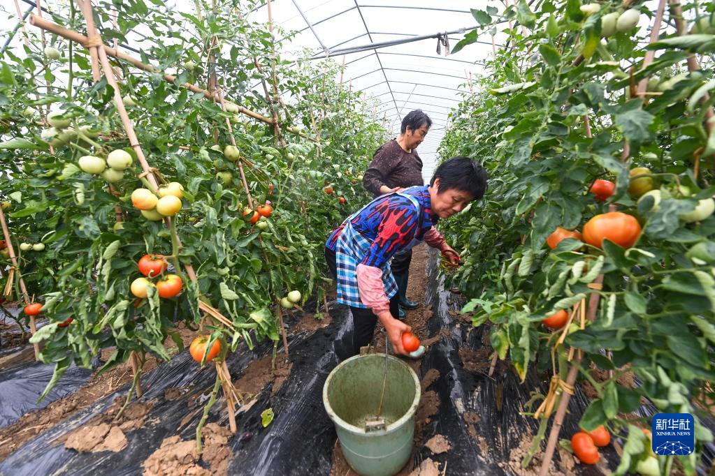 6月8日,在東白湖鎮孝義村的“美麗菜園”吳管家蔬菜基地的大棚內,村民正在采摘成熟的番茄。