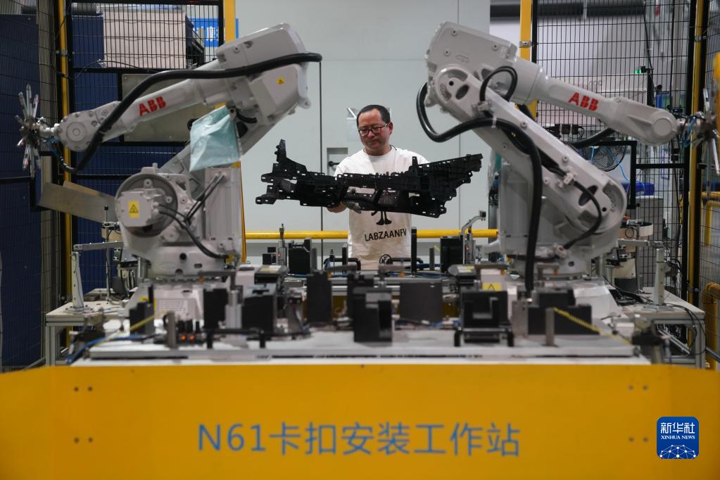 6月7日,在江蘇常熟汽飾集團生產(chǎn)車(chē)間,工人在卡扣自動(dòng)化安裝工作站上料。