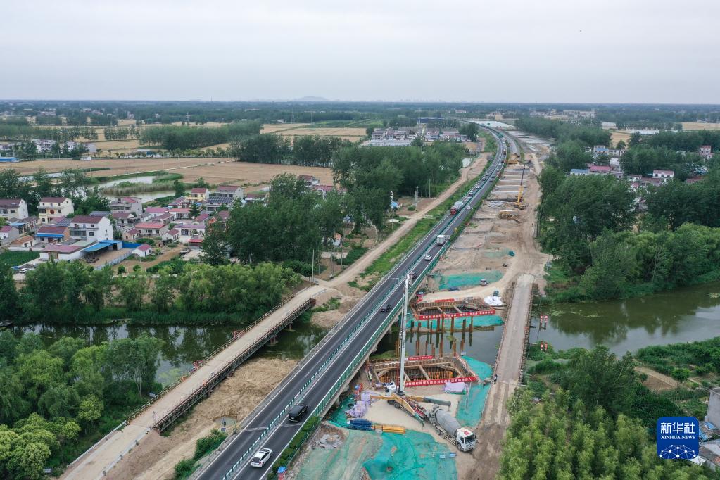 工人在長(cháng)深高速公路連云港至淮安段擴建工程李柴河大橋現場(chǎng)澆注橋墩(6月7日攝,無(wú)人機照片)。