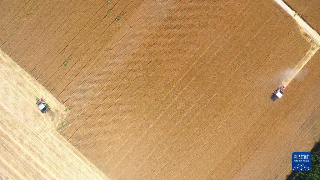 6月8日,農機手駕駛聯(lián)合收割機在山東省聊城市茌平區賈寨鎮侯樓村田間收割小麥(無(wú)人機照片)。