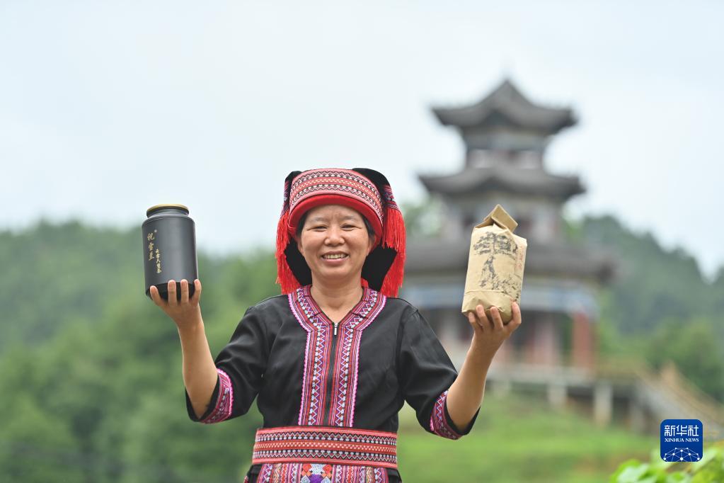 6月7日,在蒼梧縣六堡鎮山坪村,祝雪蘭在展示自己制作的六堡茶。