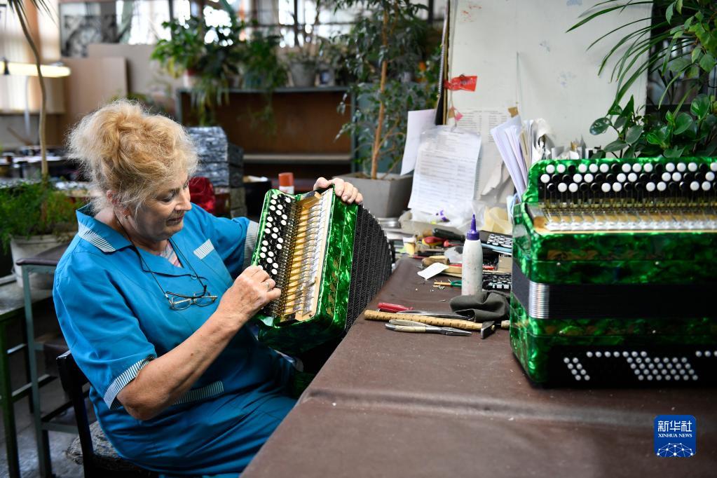 6月7日,在俄羅斯圖拉,工作人員為即將出廠(chǎng)的巴揚手風(fēng)琴試音。