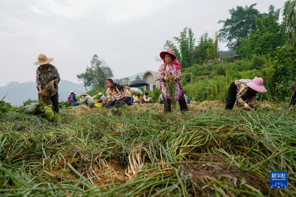 6月8日,在豐都縣虎威鎮大池社區的藠頭田,當地村民在種植大戶(hù)的組織下集體采收藠頭。