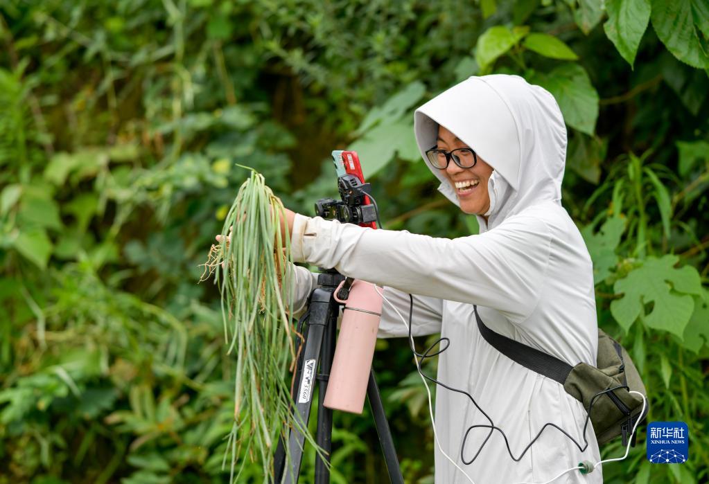 6月8日,在豐都縣虎威鎮大池社區的藠頭田,一名網(wǎng)絡(luò )主播通過(guò)網(wǎng)絡(luò )推介豐都藠頭。