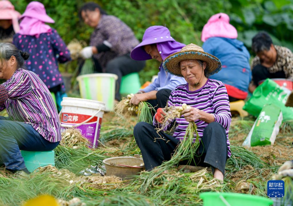 6月8日,在豐都縣虎威鎮大池社區的藠頭田,當地村民在種植大戶(hù)的組織下集體采收藠頭。