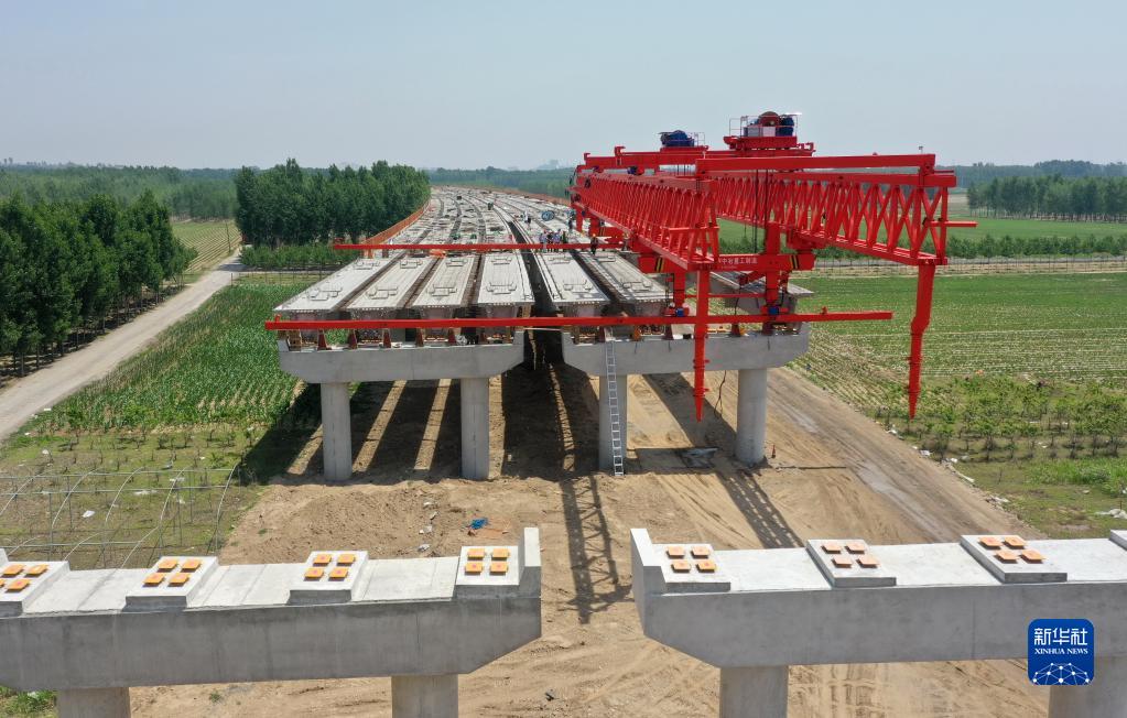 6月8日,工人在河北省昌黎縣境內的秦唐高速三標段建設工地施工(無(wú)人機照片)。