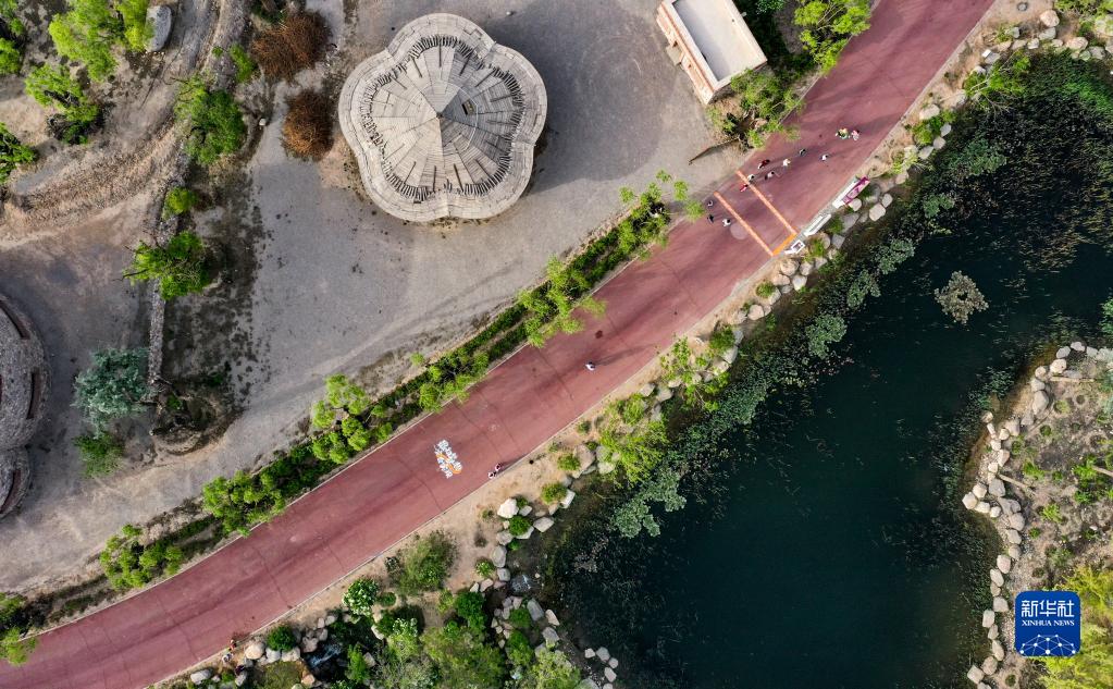市民在賀蘭山運動(dòng)休閑公園散步游覽(5月13日攝,無(wú)人機照片)。