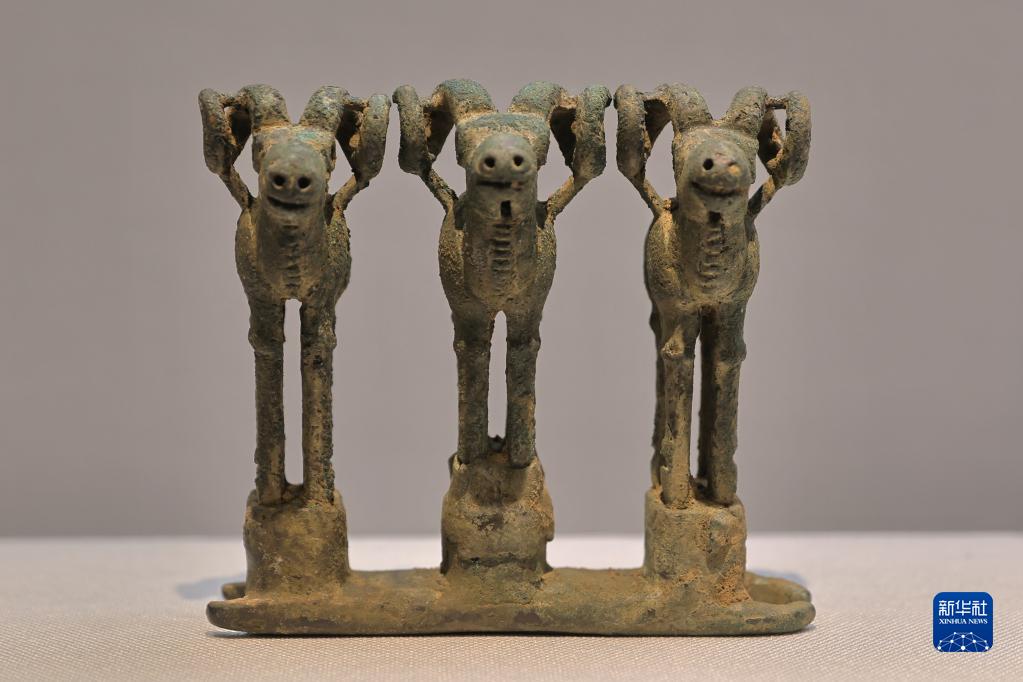 6月9日在“鄂爾多斯青銅器文物精品展”拍攝的展品“三羊形青銅車(chē)飾”。