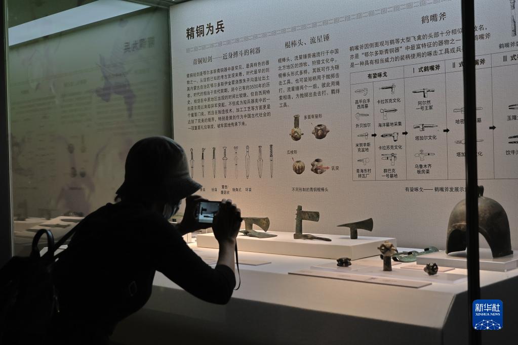 6月9日,參觀(guān)者在“鄂爾多斯青銅器文物精品展”拍攝青銅兵器。