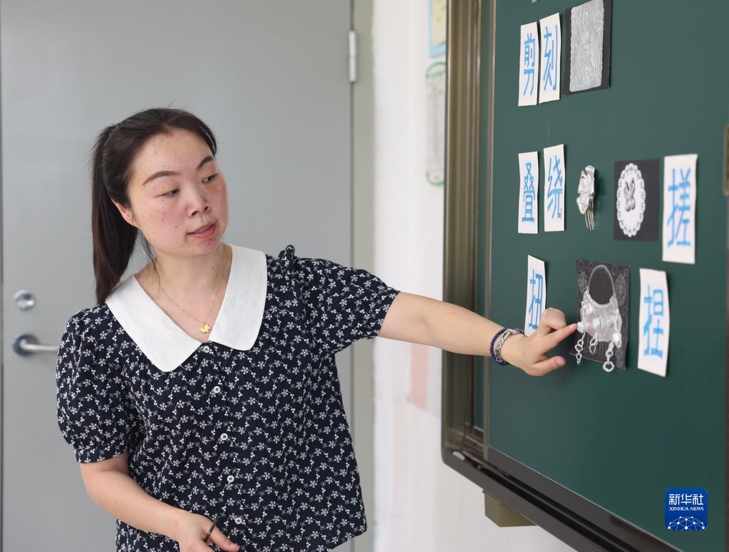 6月9日,湖南省長(cháng)沙市朝陽(yáng)小學(xué)王曉風(fēng)老師在特色美育課上向學(xué)生們介紹制作技藝。