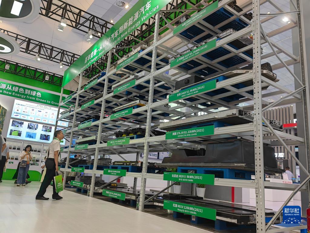 這是展覽會(huì )上一家企業(yè)展示的回收的新能源汽車(chē)動(dòng)力電池(6月9日攝)。