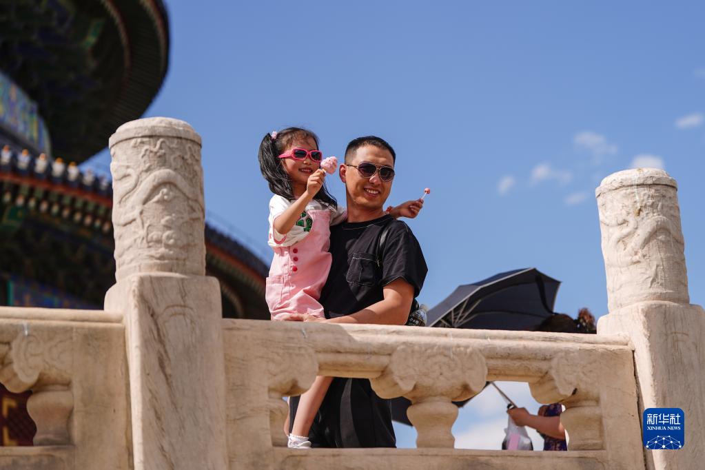 6月9日,游客在天壇祈年殿留影。