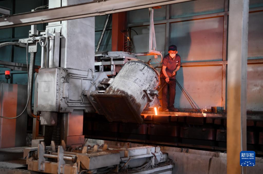 6月9日,河北滄州泊頭市亞奇鑄業(yè)有限公司工人在進(jìn)行澆鑄作業(yè)。