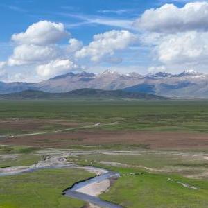 夏日,青海省南部的高原草原一碧千里,與雪山、白云相映成趣,景色宜人。