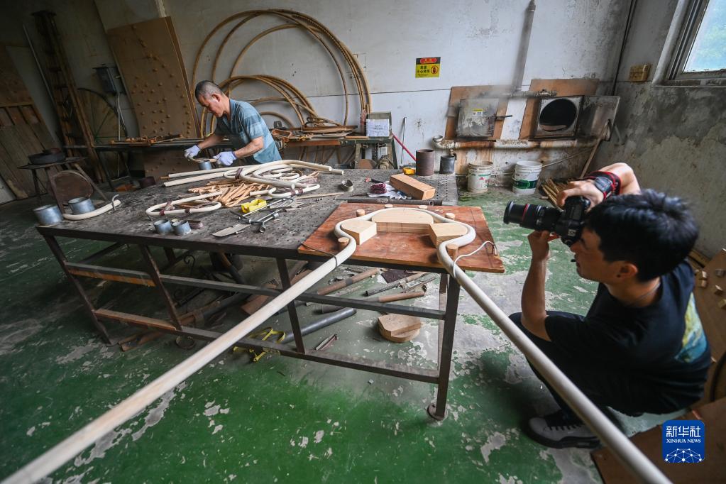 在位于杭州拱墅區的杭州昌盛藤器廠(chǎng)內,自然造物文化創(chuàng )意團隊的工作人員在記錄工人手工加工藤器的過(guò)程(6月7日攝)。這個(gè)廠(chǎng)生產(chǎn)的傳統藤編制品通過(guò)自然造物文化創(chuàng )意團隊在多地的民間手工藝文化空間進(jìn)行展示推廣。