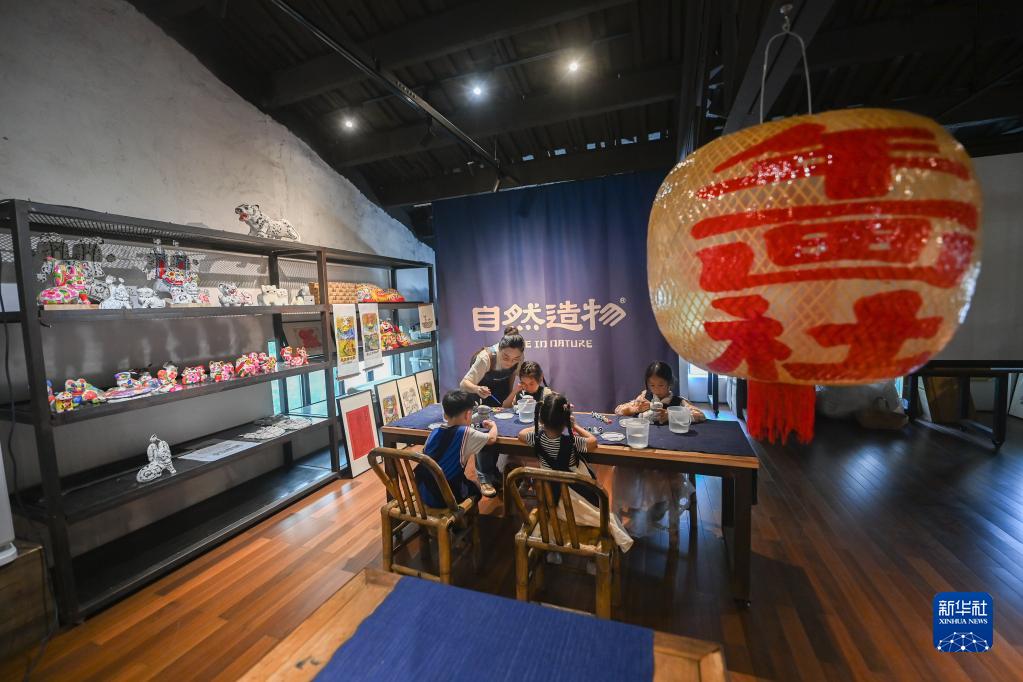 在位于杭州瓶窯老街的自然造物民藝研究中心內,工作人員帶著(zhù)孩子們在體驗泥塑彩繪技藝(5月28日攝)。該中心是占地3500多平方米的民間手工藝文化空間,集中展示來(lái)自全國二十多個(gè)省份數千種手工藝產(chǎn)品。顧客也可以在這里體驗包括木版年畫(huà)拓印、泥塑彩繪、油紙傘制作、竹編燈籠、刺繡等非遺技藝。