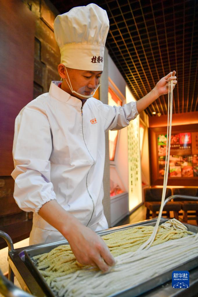 在天津桂發(fā)祥十八街麻花文化館,趙寶陽(yáng)完成手工麻花制作中白條和麻條的制作步驟(6月8日攝)。