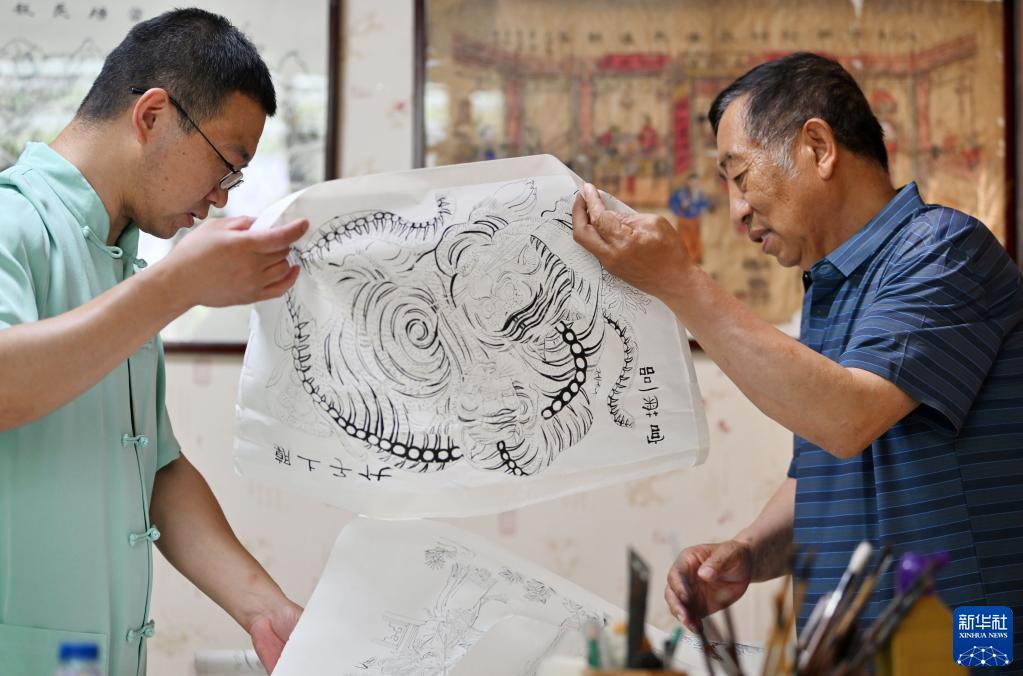 在天津市西青區的楊柳青霍氏古一張畫(huà)店,霍樹(shù)林(左)和父親霍慶有交流下一階段的年畫(huà)制作(6月6日攝)。